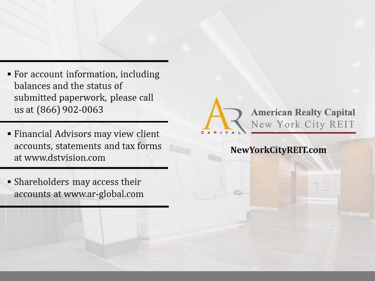 12 NewYorkCityREIT.com ▪ For account information, including balances and the status of submitted paperwork, please call us at (866) 902 - 0063 ▪ Financial Advisors may view client accounts, statements and tax forms at www.dstvision.com ▪ Shareholders may access their accounts at www.ar - global.com