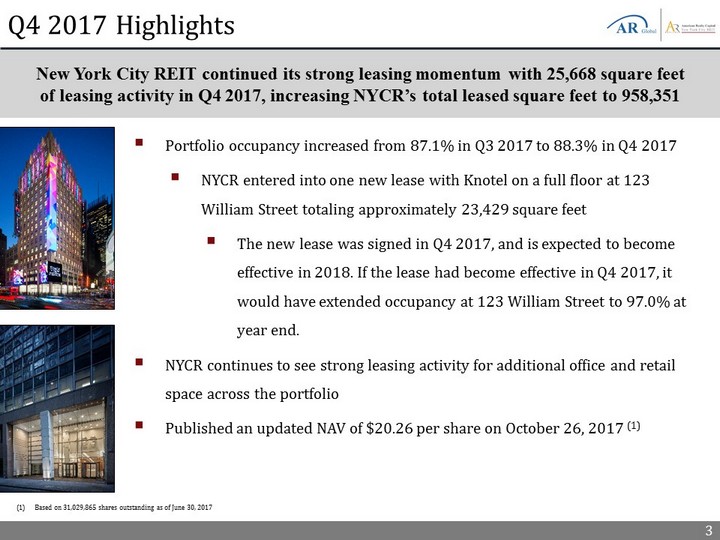 2 Important Information Risk Factors For a discussion of the risks which should be considered in connection with our company, see the section entitled “Item 1 A . Risk Factors” in American Realty Capital New York City REIT, Inc . ’s (the “Company” or “NYCR”) Annual Report on Form 10 - K filed with the U . S . Securities and Exchange Commission (“SEC”) on March 19 , 2018 . Forward - Looking Statements This presentation may contain forward - looking statements . These forward - looking statements involve substantial risks and uncertainties . Actual results or events could differ materially from the plans, intentions and expectations disclosed in the forward - looking statements the Company makes . You can identify forward - looking statements by the use of forward looking terminology such as “believes,” “expects,” “may,” “will,” “would,” “could,” “should,” “seeks,” “intends,” “plans,” “projects,” “estimates,” “anticipates,” “predicts,” or “potential” or the negative of these words and phrases or similar words or phrases . Please review the end of this presentation and the Company’s Annual Report on Form 10 - K and Quarterly Reports on Form 10 - Q for a more complete list of risk factors, as well as a discussion of forward - looking statements .