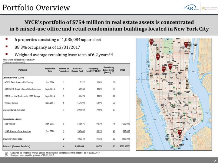 5 Key Initiatives (1) Based on total real estate investments at cost and total mortgage notes payable, net of deferred financing costs per 12/31/17 b alance sheet ▪ NYCR’s management team is continuing to execute its strategy to: ▪ Strategically market vacancy to increase occupancy levels ▪ Maintain the portfolio’s overall quality and an efficient capital structure ▪ Position the Company for a liquidity event or sale ▪ Debt/cost ratio remains low at ~31% (1) providing room for additional leverage and potential portfolio growth ▪ Continue to focus on lease up of vacancy at 9 Times Square, 1140 Avenue of the Americas and 123 William Street ▪ Pursue selective acquisitions in New York City at attractive cap rates NYCR Continues to Execute its Strategy