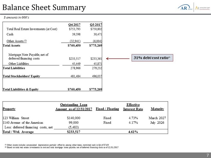 6 Portfolio Overview (1) Calculated as weighted average (based on annualized straight - line rental income) as of 12/31/2017. (2) Mortgage notes payable, gross as of 12/31/2017. ▪ 6 properties consisting of 1,085,084 square feet ▪ 88.3% occupancy as of 12/31/2017 ▪ Weighted average remaining lease term of 6.2 years (1) NYCR’s portfolio of $754 million in real estate assets is concentrated in 6 mixed - use office and retail condominium buildings located in New York City Real Estate Investment Summary ($ amounts in thousands) Portfolio Acquisition Date Number of Properties Rentable Square Feet Occupancy (as of 12/31/17) Remaining Lease Term (Years) (1) Debt Unencumbered Assets 421 W 54th Street – Hit Factory Jun. 2014 1 12,327 100% 2.8 400 E 67th Street – Laurel Condominium Sept. 2014 1 58,750 100% 6.3 200 Riverside Boulevard – ICON Garage Sept. 2014 1 61,475 100% 19.8 9 Times Square Nov. 2014 1 167,390 63.9% 5.5 Unencumbered Sub - total 4 299,942 79.9% 6.4 Encumbered Assets 123 William Mar. 2015 1 542,676 92.7% 7.8 $140,000 1140 Avenue of the Americas Jun. 2016 1 242,466 89.1% 4.2 $99,000 Encumbered Sub - total 2 785,142 91.6% 6.1 $239,000 Sub - total (Current Portfolio) 6 1,085,084 88.3% 6.2 $239,000 (2)