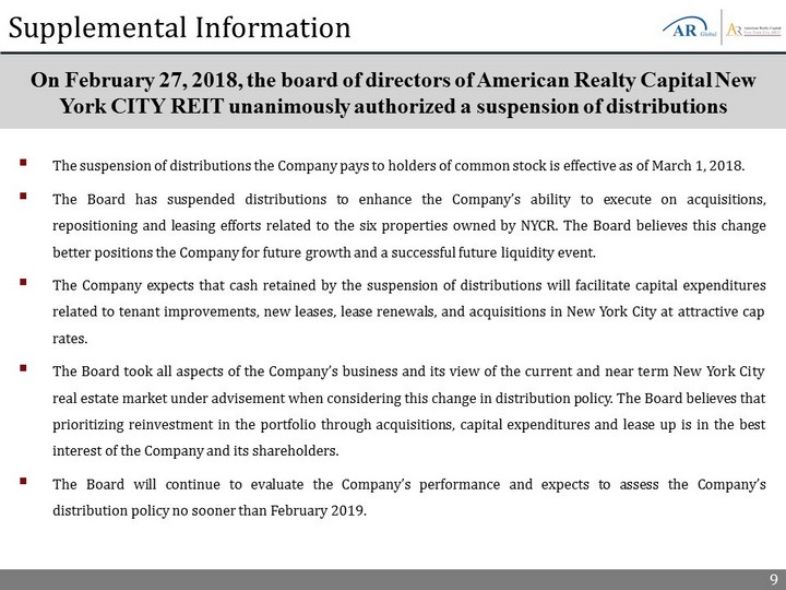 9 Supplemental Information ▪ The suspension of distributions the Company pays to holders of common stock is effective as of March 1 , 2018 . ▪ The Board has suspended distributions to enhance the Company’s ability to execute on acquisitions, repositioning and leasing efforts related to the six properties owned by NYCR . The Board believes this change better positions the Company for future growth and a successful future liquidity event . ▪ The Company expects that cash retained by the suspension of distributions will facilitate capital expenditures related to tenant improvements, new leases, lease renewals, and acquisitions in New York City at attractive cap rates . ▪ The Board took all aspects of the Company’s business and its view of the current and near term New York City real estate market under advisement when considering this change in distribution policy . The Board believes that prioritizing reinvestment in the portfolio through acquisitions, capital expenditures and lease up is in the best interest of the Company and its shareholders . ▪ The Board will continue to evaluate the Company’s performance and expects to assess the Company’s distribution policy no sooner than February 2019 . On February 27, 2018, the board of directors of American Realty Capital New York CITY REIT unanimously authorized a suspension of distributions