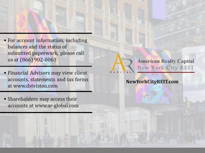 11 NewYorkCityREIT.com ▪ For account information, including balances and the status of submitted paperwork, please call us at (866) 902 - 0063 ▪ Financial Advisors may view client accounts, statements and tax forms at www.dstvision.com ▪ Shareholders may access their accounts at www.ar - global.com