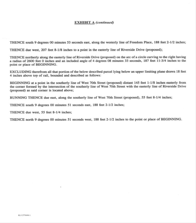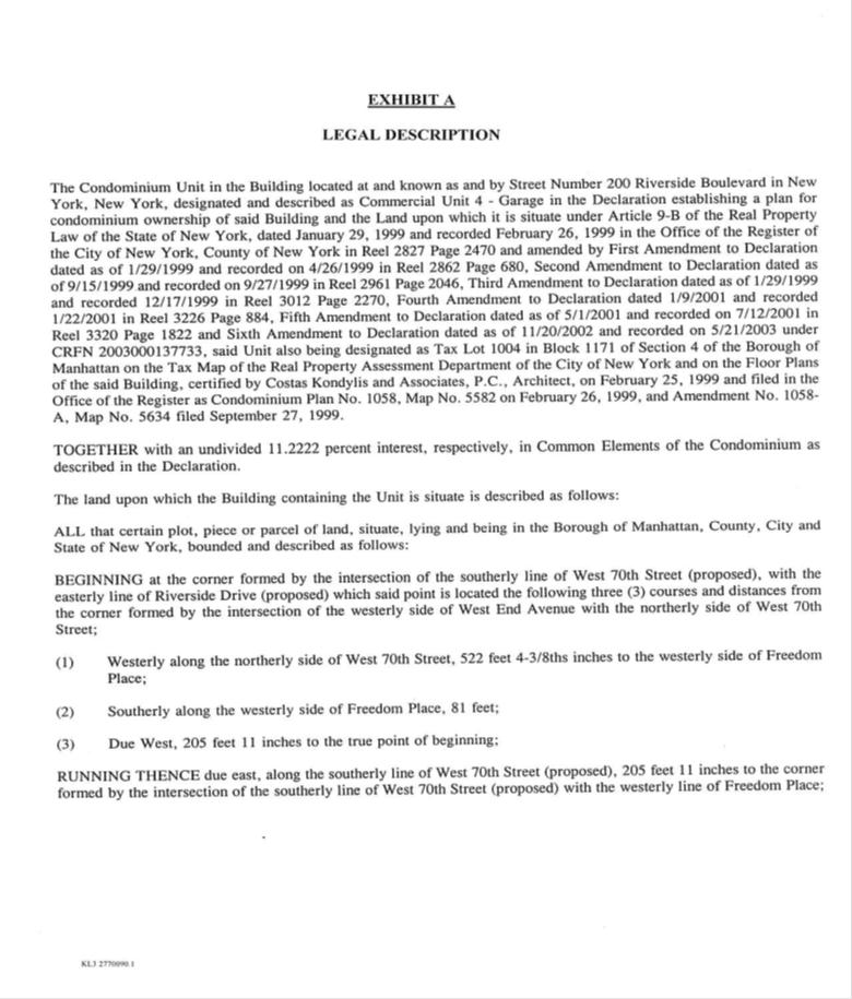 The Declaration establishing a plan for condominium ownership of the building located at and known as and by street number 200 Riverside Boulevard in New York, New York and the land upon which it is situate under Article 9-B of the Real Property Law of the State of New York, dated January 29, 1999 and recorded February 26, 1999 in the Office of the Register of the City of New York, County of New York in Reel 2827 Page 2470 and amended by First Amendment to Declaration dated as of 1/29/1999 and recorded on 4/26/1999 in Reel 2862 Page 680, Second Amendment to Declaration dated as of 9/15/1999 and recorded on 9/27/1999 in Reel 2961 Page 2046, Third Amendment to Declaration dated as of 1/29/1999 and recorded 12/17/1999 in Reel 3012 Page 2270, Fourth Amendment to Declaration dated 1/9/2001 and recorded 1/22/2001 in Reel 3226 Page 884, Fifth Amendment to Declaration dated as of 5/1/2001 and recorded on 7/12/2001 in Reel 3320 Page 1822 and Sixth Amendment to Declaration dated as of 11/20/2002 and recorded on 5/21/2003 under CRFN 2003000137733, the condominium unit in such building, designated as Commercial Unit 4- Garage, is also being designated as Tax Lot 1004 in Block 1171 of Section 4 of the Borough of Manhattan on the Tax Map of the Real Property Assessment Department of the City of New York and on the Floor Plans of the such building, certified by Costas Kondylis and Associates, P.C., Architect, on February 25, 1999 and filed in the Office of the Register as Condominium Plan No. 1058, Map No. 5582 on February 26, 1999, and Amendment No. 1058¬A, Map No. 5634 filed September 27, 1999